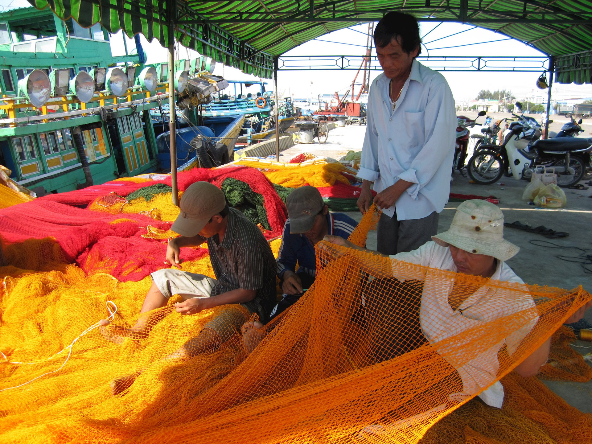 Ngư dân tranh thủ vá lại lưới, tu sửa máy móc để chuyến biển an toàn, hiệu quả.