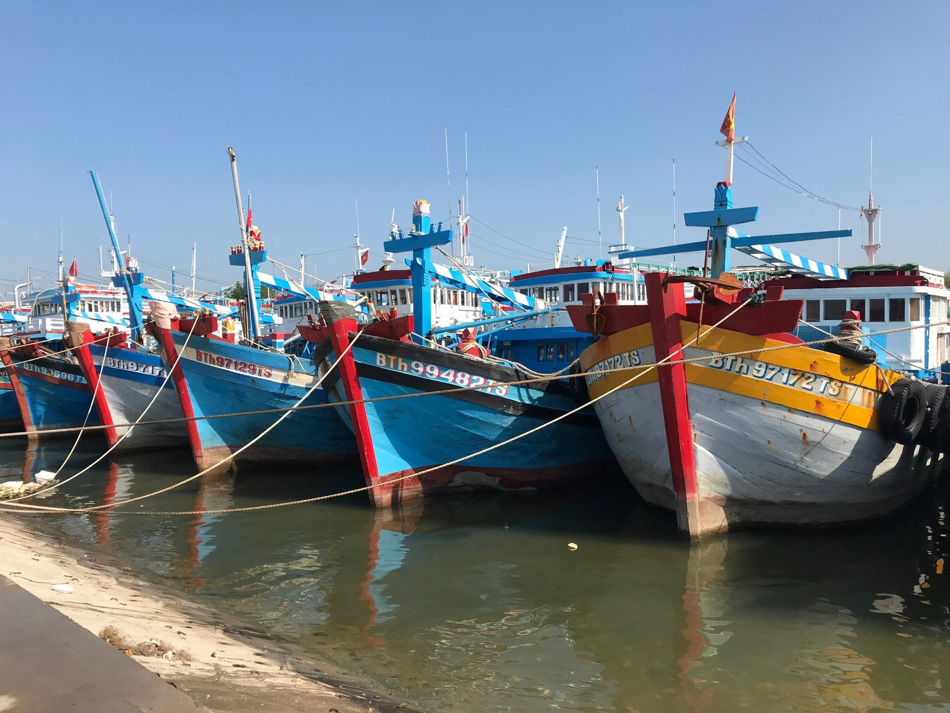Những ngày đầu tháng 11/2023, tại cảng cá Cồn Chà, cảng cá Phú Hải (TP. Phan Thiết), không còn cảnh tấp nập, nhộn nhịp, vận chuyển hải sản lên xuống như 1 tháng trước đó. Thêm thông tin dự báo có gió mạnh, sóng lớn và mưa dông trên biển khiến hàng trăm tàu thuyền lớn nhỏ nằm san sát dọc sông Cà Ty những ngày qua. Năm nào cũng thế, tới mùa biển động, ngư dân lại tranh thủ kéo tàu thuyền lên ụ tu sửa, vá lại lưới, mua sắm ngư thiết bị cần thiết và nghe ngóng thời tiết cho chuyến biển trong vụ bấc.