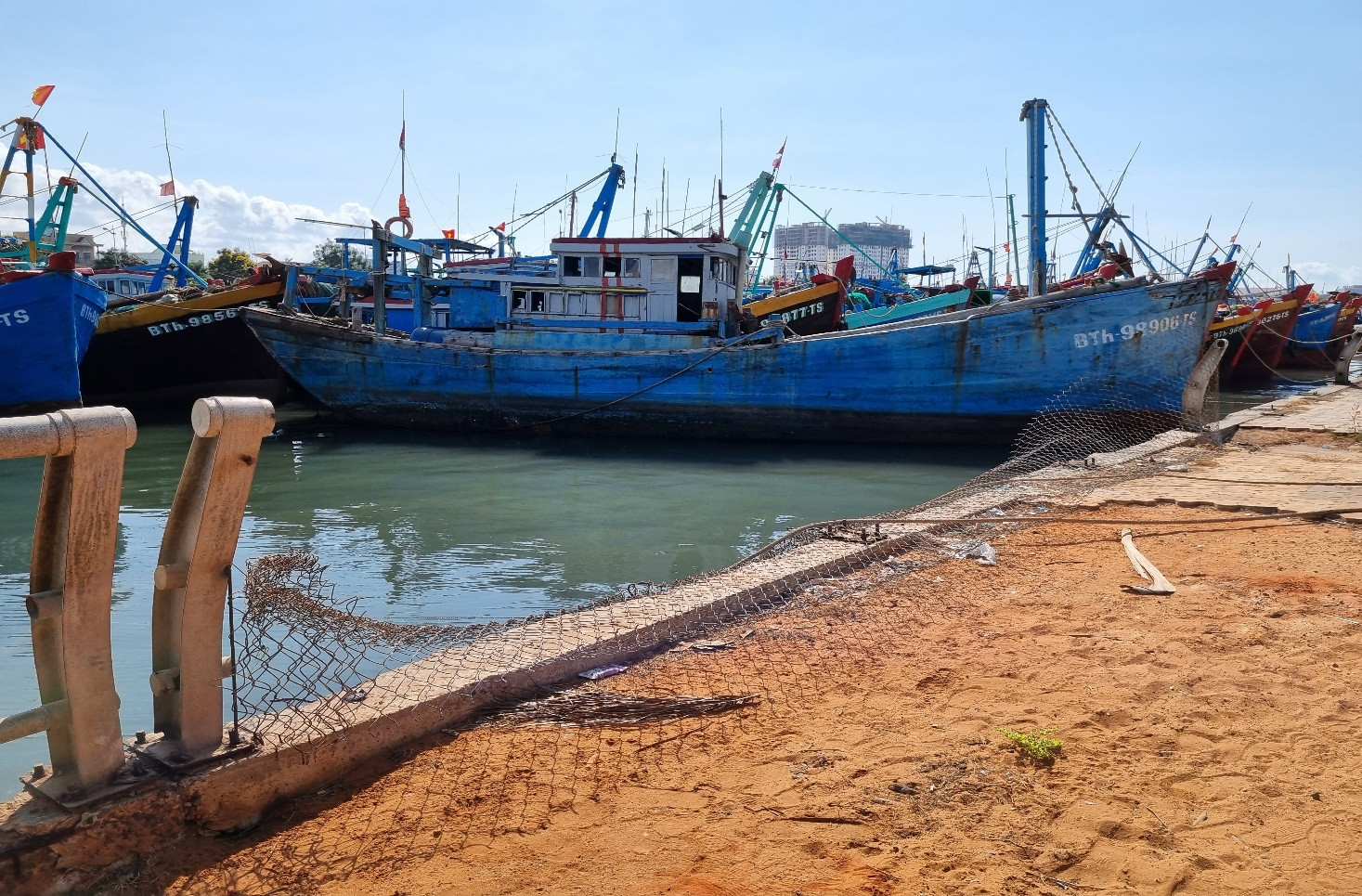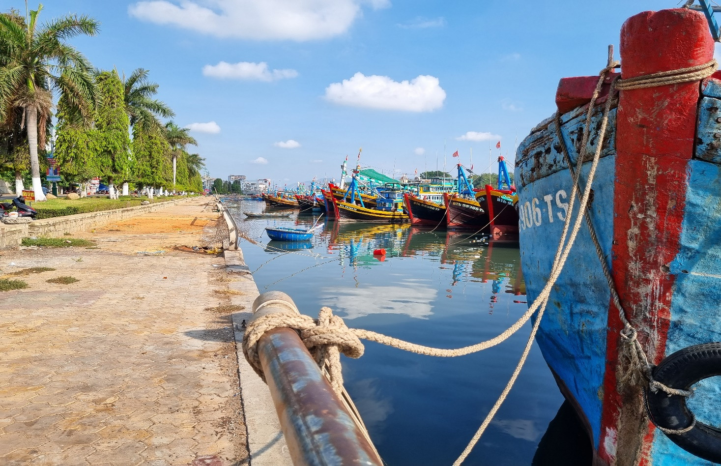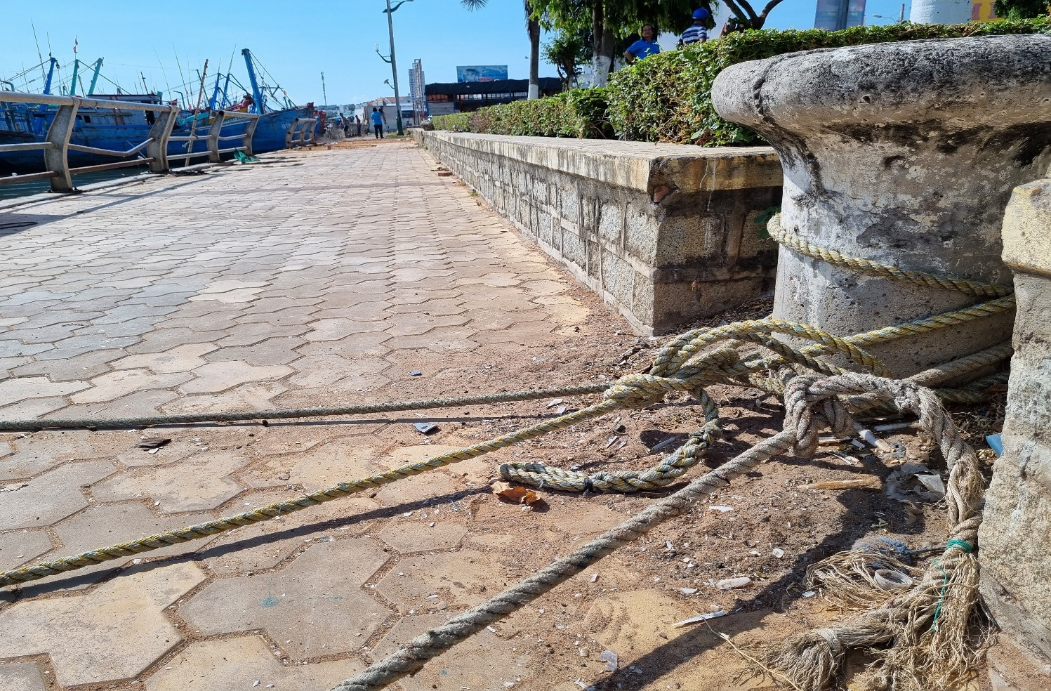 Đây là một đoạn lan can bờ kè đã không còn, việc buộc dây neo như vậy khi gặp tàu thuyền lớn đi ngang sẽ tạo thành sóng lớn, làm giật lùi các tàu thuyền neo đậu. Về lâu dài, dưới tác động lực kéo sẽ gây hư hỏng lan can. Việc không còn lan can bảo vệ sẽ tiềm ẩn rất nhiều rủi ro nguy hiểm.